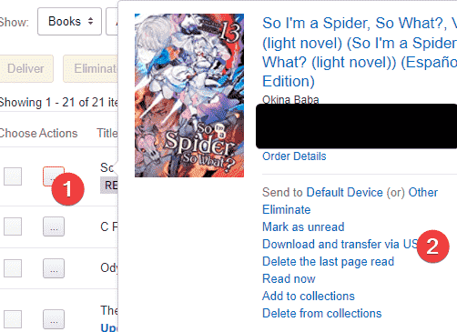 Press the “…” button for the book your wish to download, then, in the new window, press the “Download and transfer via USB”.